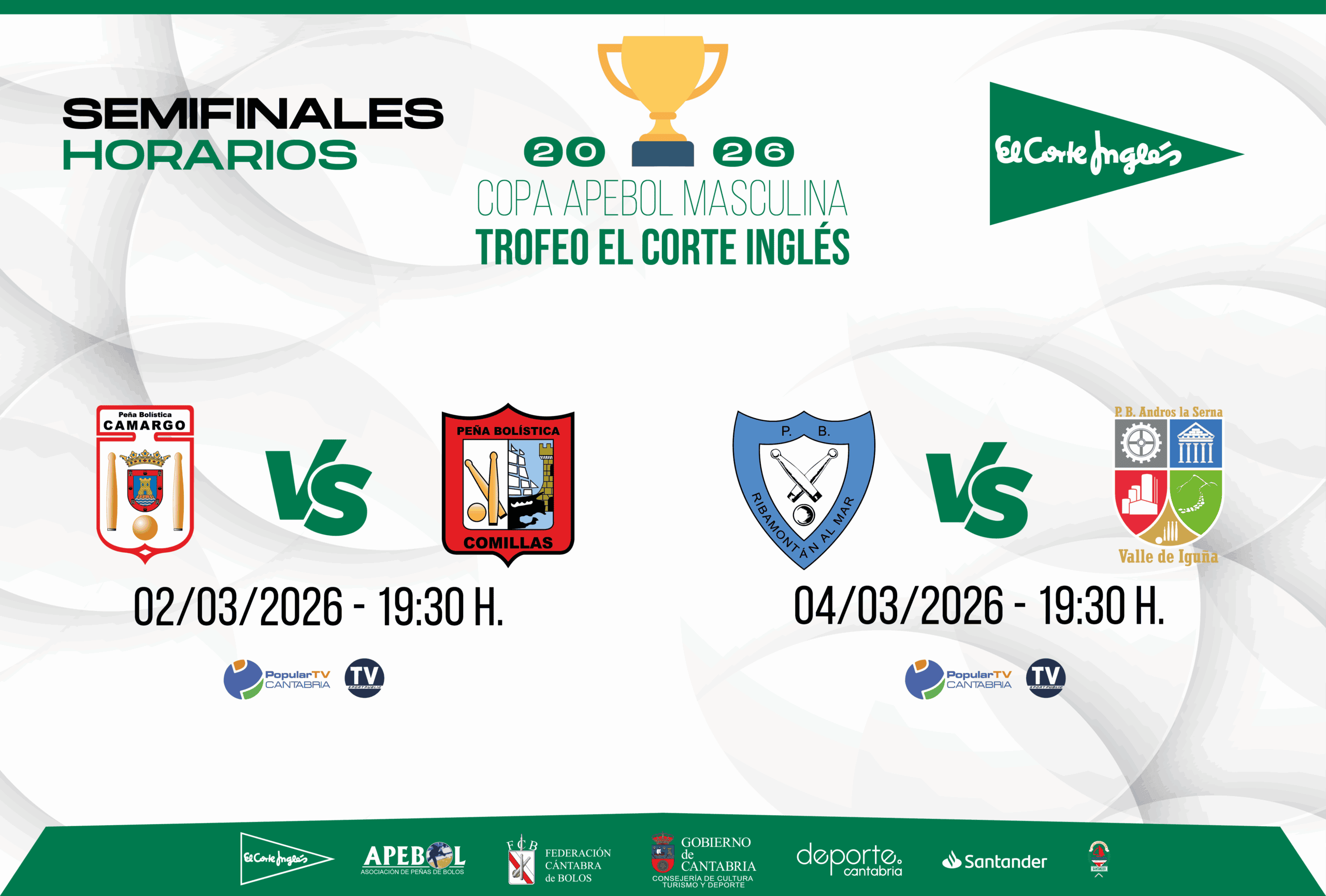 Tras la disputa de la ronda de cuartos de final, las peñas que han accedido a la ronda de semifinales son Camargo, Comillas, Ribamontán al Mar Const. Cárcoba y Andros La Serna Valle de Iguña.