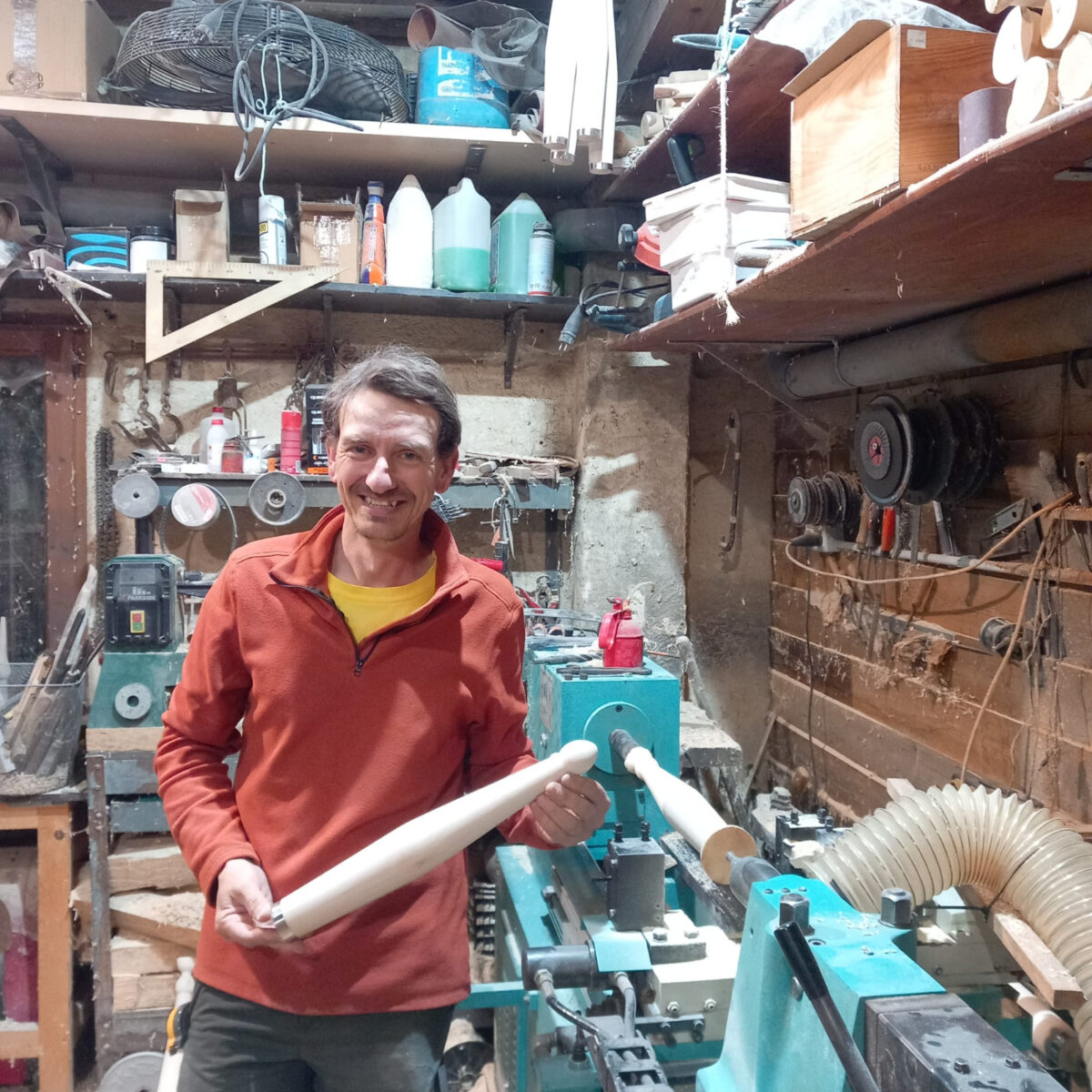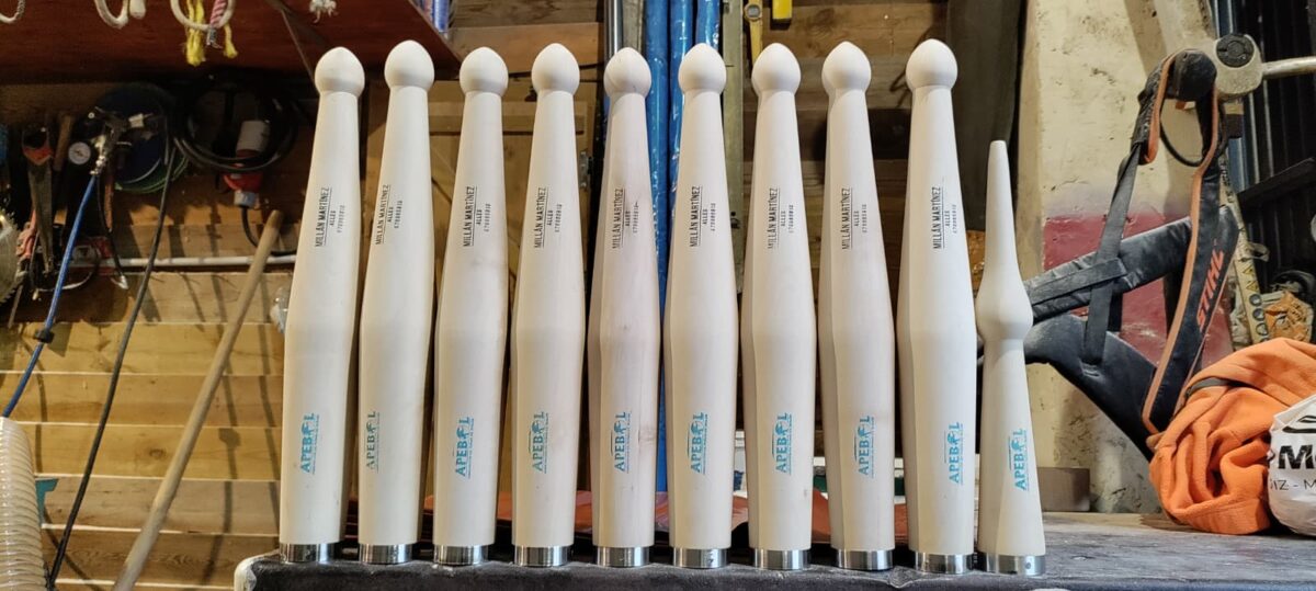 Millán Martínez lleva haciendo bolos aproximadamente cinco años. Empezó casi por casualidad. Él entrenaba con José Antonio y Adrián Soberón, a las órdenes de Toño Gómez, y lo hacían con bolos “en no muy buenas condiciones”, así que un día se propuso hacer un juego con un torno simple, que no era ni copiador, y “me salieron bien”. Se fue animando poco a poco. Al principio los regalaba y vendía alguno a cuentagotas, pero en 2021 ya se lo tomó más en serio y ahora no da abasto, los pedidos son innumerables. Trabaja con dos maderas, abedul y avellano, aunque “de esta última solo los quieren algunos puristas”. La mayor dificultad es conseguir madera de calidad, que sea ligera, porque la mayoría de la gente quiere que los bolos pesen poco”. La dificultad en este momento no es la materia prima sino el tiempo, porque compagina su labor de tornero bolístico con su profesión y esto le supone un sobreesfuerzo, al margen de ‘robar’ horas también a su familia.